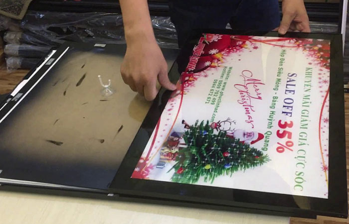 - Cách thay tranh: cũng gần tương tự như cách gắn tranh nhưng lần này bạn sẽ tháo tấm backlit chứa nội dung cũ ra và dán tấm mới vào. Sau đó đưa lên khung để cho nam châm hút lại như cũ.