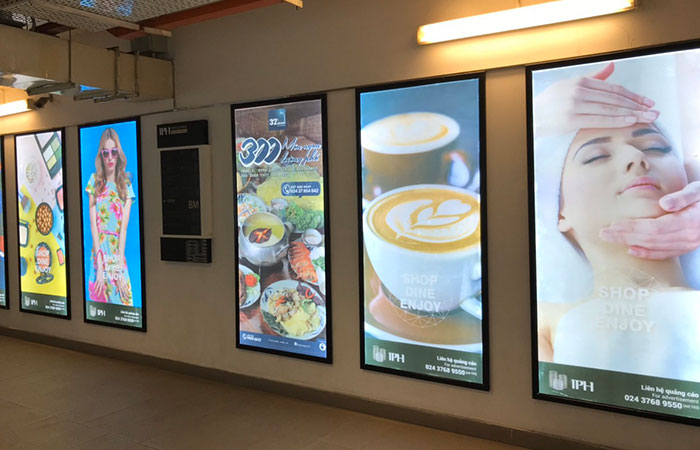 - Gắn ở thang máy: rất nhiều trung tâm thương mại, chung cư hiện nay thường dùng hộp đèn siêu mỏng để quảng cáo. Họ thường lắp vào khu vực thang máy để những người dùng đi lại có thể xem được các thông tin quảng cáo này.